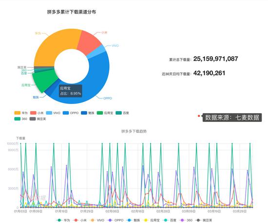 第三款:拼多多,成长最快的电商App之一,腾讯投资系公司。在七麦数据上显示,应用宝占比8。 95%。近三个月数据下载,华为商店和OPPO商店两个渠道领先,应用宝数据在小米之后。但是拼多多这个下载总量数据显示,为了提升排名,要么是渠道,要么是推广方,有刷量和数据注水嫌疑。