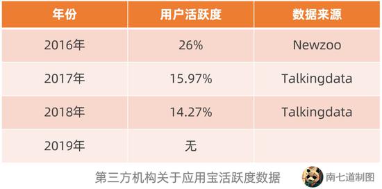 以下根据Newzoo、Talkingdata第三方机构数据,腾讯应用宝用户活跃度2016-2018年分别为26%、15.97%、14.27%,数据一路下滑,2019年没有找到相关数据。