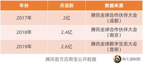 腾讯应用宝官方数据也显示,形势一片大好。腾讯每一年都会举行全球合作伙伴大会,会上发布各种数据。2017年-2019年,应用宝官方公布的月活用户分别是2亿、2.4亿、2.6亿,增速最高为20%。